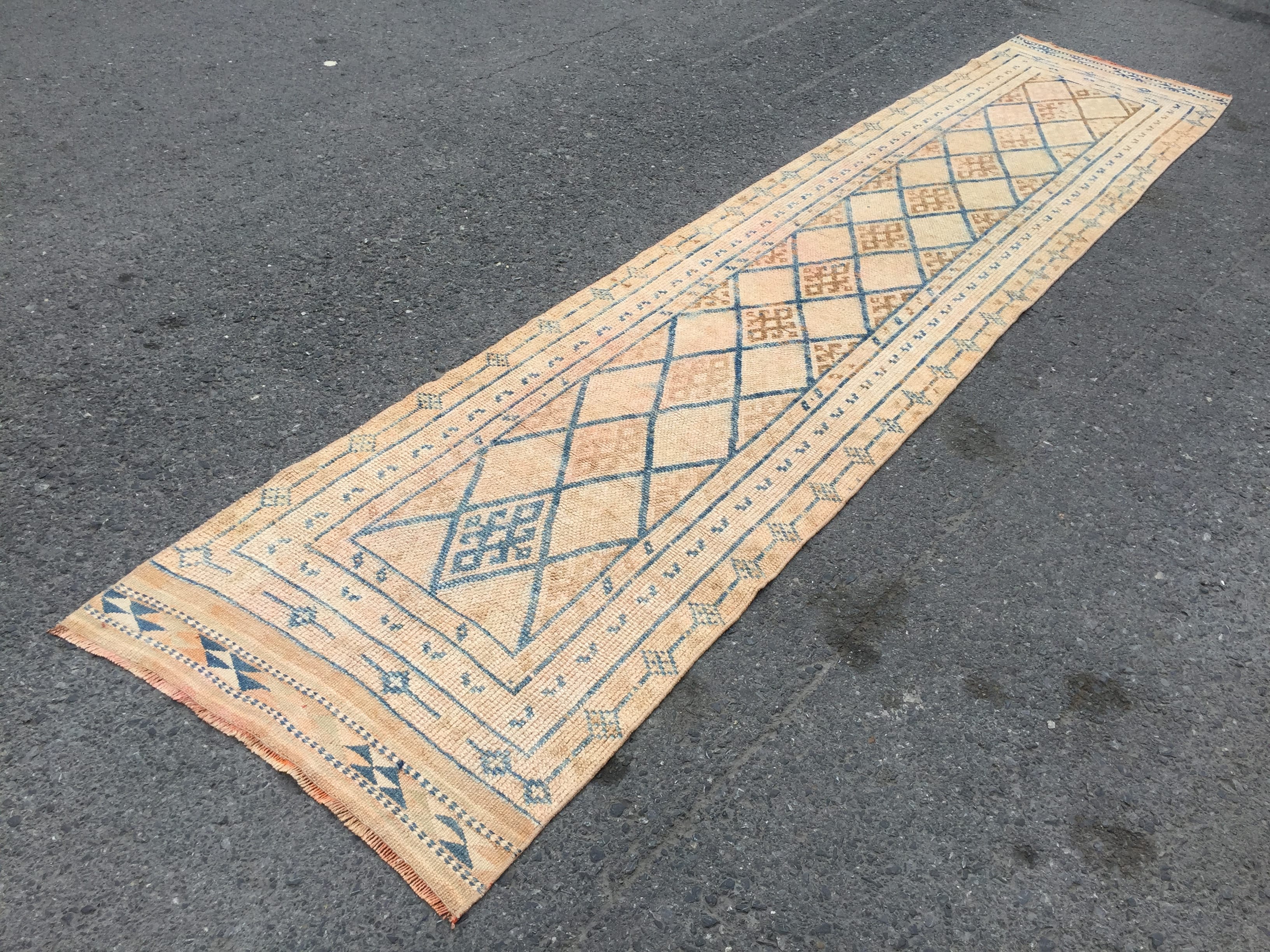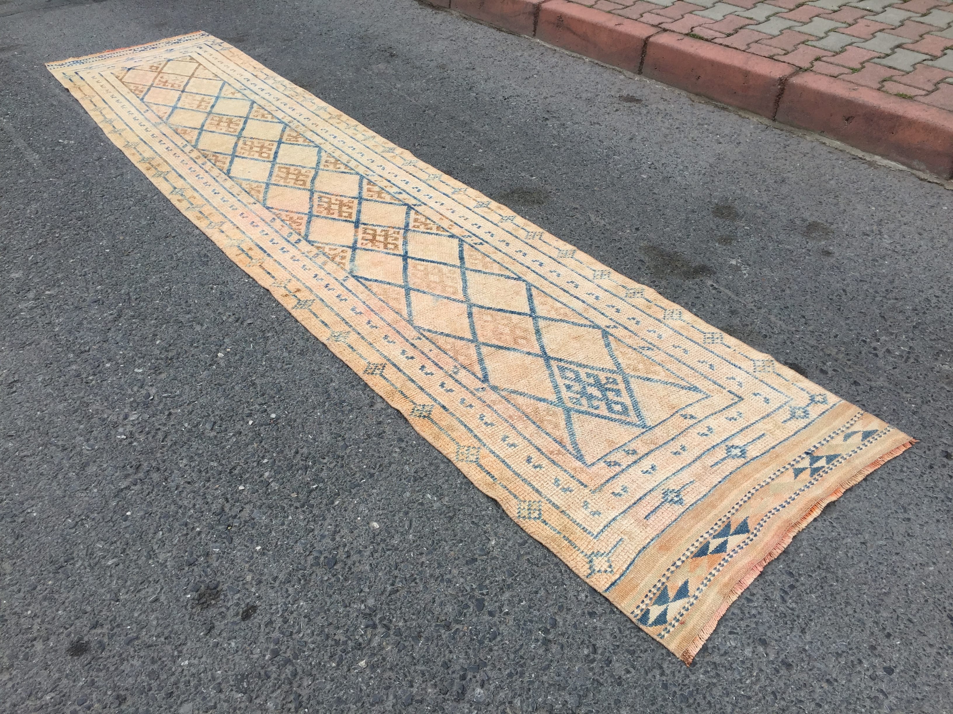 3x12 retro geometric runner, distressed runner, corridor rug , kitchen runner, oriental runner, vintage runner, faded runner, Turkish runner,